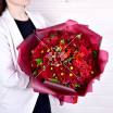 роза красная – 3 шт., роза красная кустовая – 2 шт., альстромерия красная – 1 шт., хризантема красная (бордо) кустовая – 1 шт., зелень декоративная (рускус), упаковка, лента.